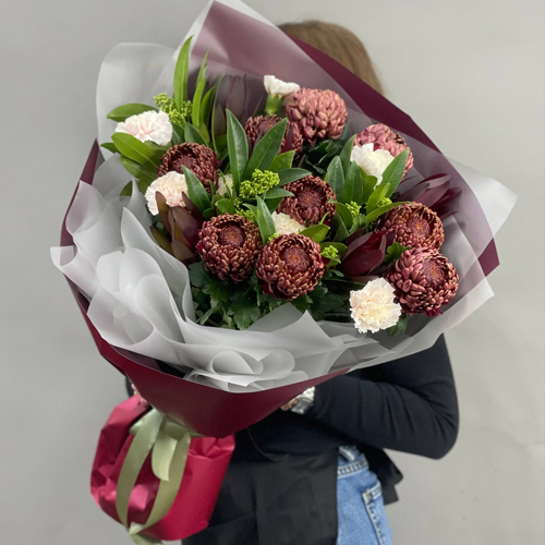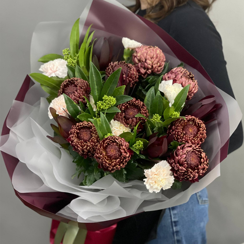 Букет "Будет счастье" из хризантем Бигоуди, сафари, скиммии и диантусов
