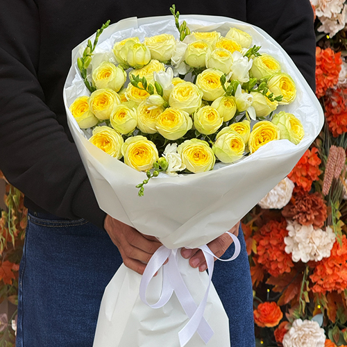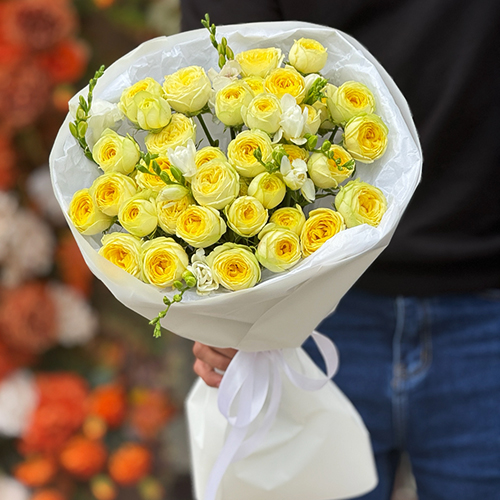 Букет "Всё решено" из лимонных пионовидных кустовых роз и ароматных фрезий