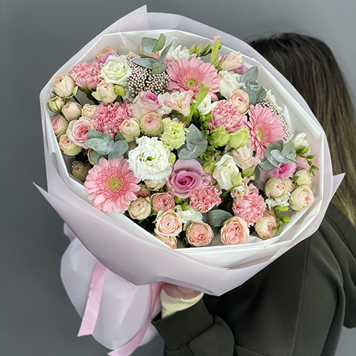 Букет "Я с тобой" из роз, эвкалипта, гербер, ароматных фрезий, озатамнуса, эустом и диантусов